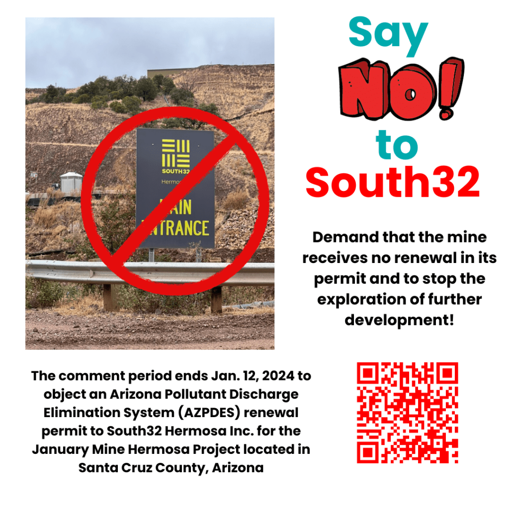 The comment period ends Jan. 12, 2024 to object an Arizona Pollutant Discharge Elimination System (AZPDES) renewal permit to South32 Hermosa Inc. for the January Mine Hermosa Project located in Santa Cruz County, Arizona.